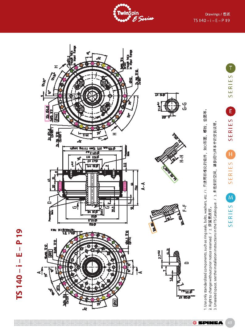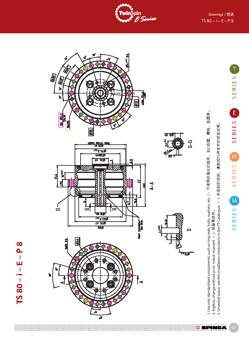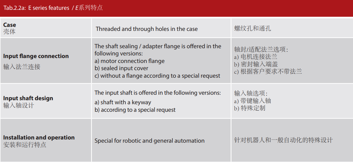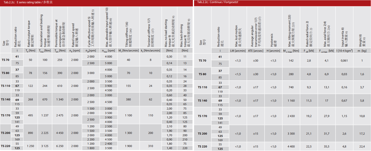 E 系列是帶有法蘭形殼體的Twinspin高精度減速機。 該系列內部包含精密減速機構和高強度交叉滾子軸承,又 名“軸承式減速機”。這種設計可以把負載直接安裝在減 速機輸出法蘭上,省去輸出端的額外軸承。 T系列采用模塊化設計,允許用戶通過電機法蘭的方式連 接各種電機。 標準的T系列減速機為半密封狀態(tài);需要用輸入法蘭和墊 圈密封。SPINEA可根據(jù)客戶電機結構提供全密封帶輸入 法蘭的減速機。