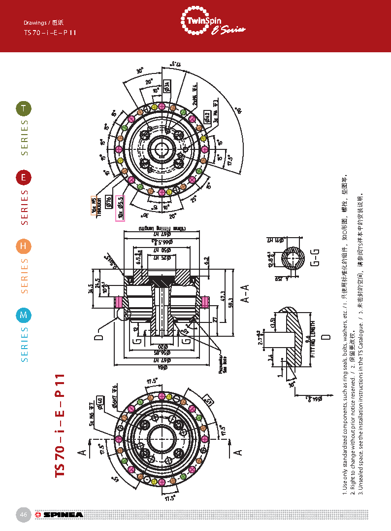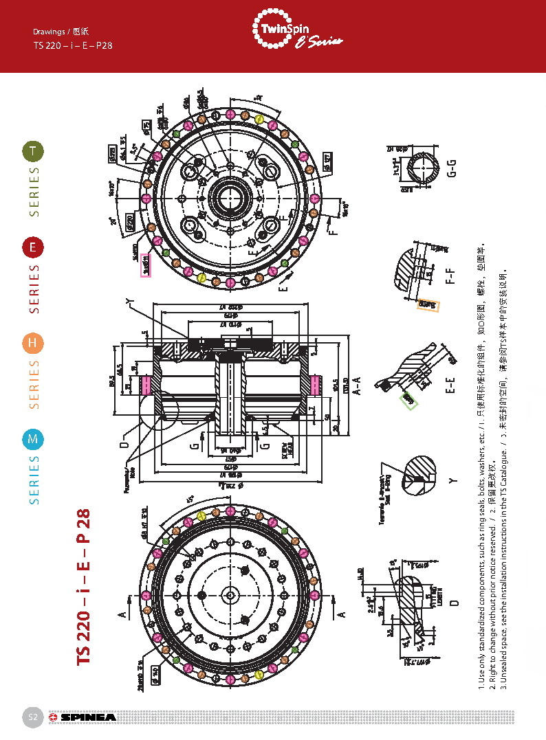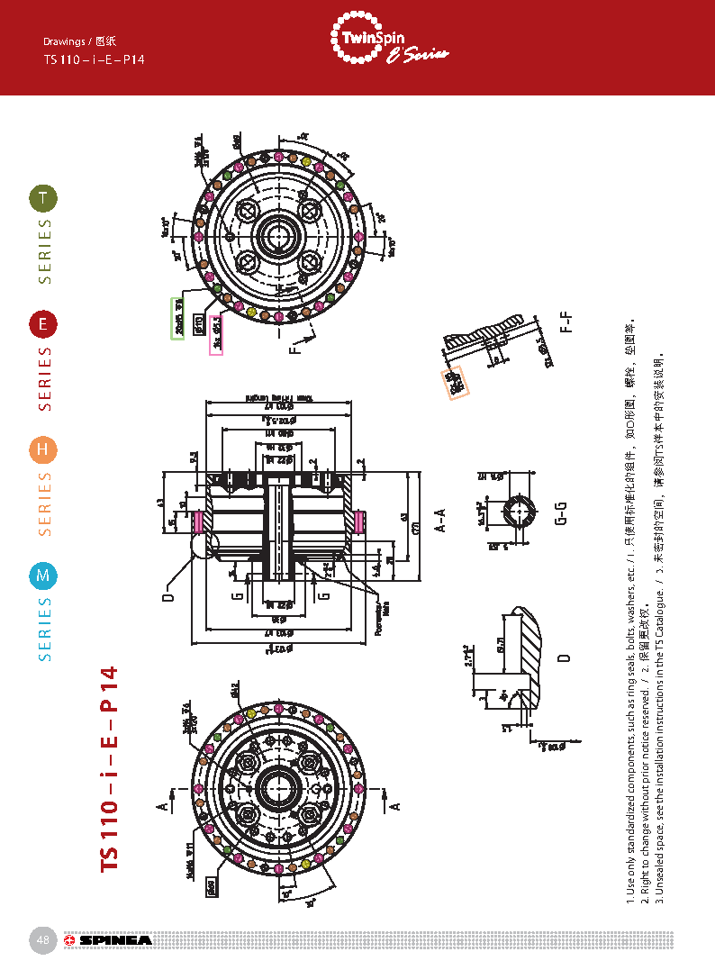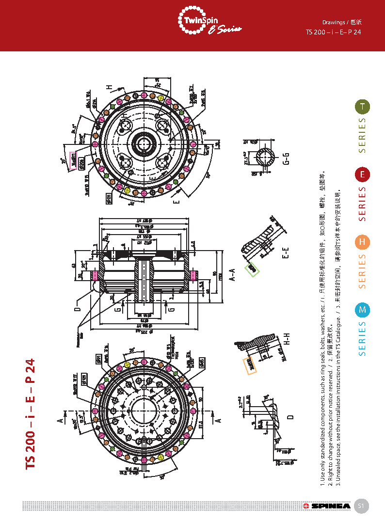 E 系列是帶有法蘭形殼體的Twinspin高精度減速機。 該系列內部包含精密減速機構和高強度交叉滾子軸承,又 名“軸承式減速機”。這種設計可以把負載直接安裝在減 速機輸出法蘭上,省去輸出端的額外軸承。 T系列采用模塊化設計,允許用戶通過電機法蘭的方式連 接各種電機。 標準的T系列減速機為半密封狀態(tài);需要用輸入法蘭和墊 圈密封。SPINEA可根據(jù)客戶電機結構提供全密封帶輸入 法蘭的減速機。